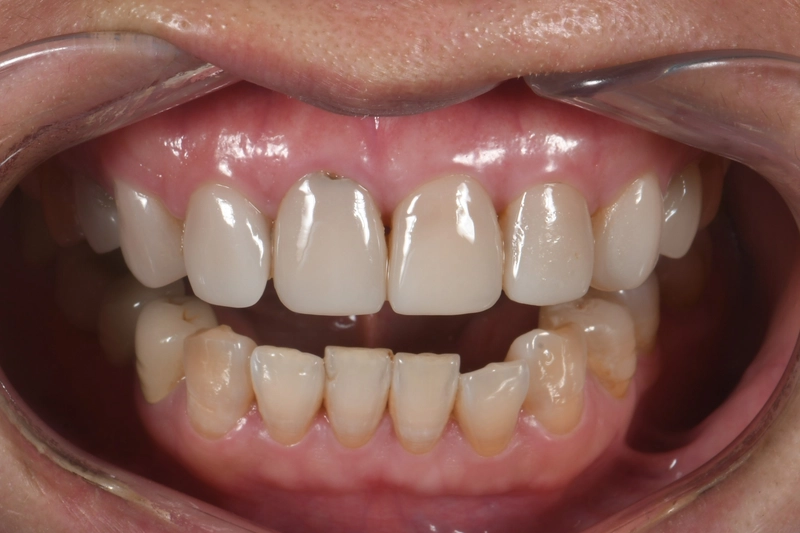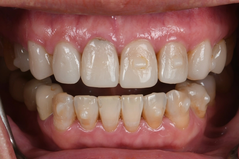 下排牙齒不整齊,陶瓷貼片下存在著蛀牙