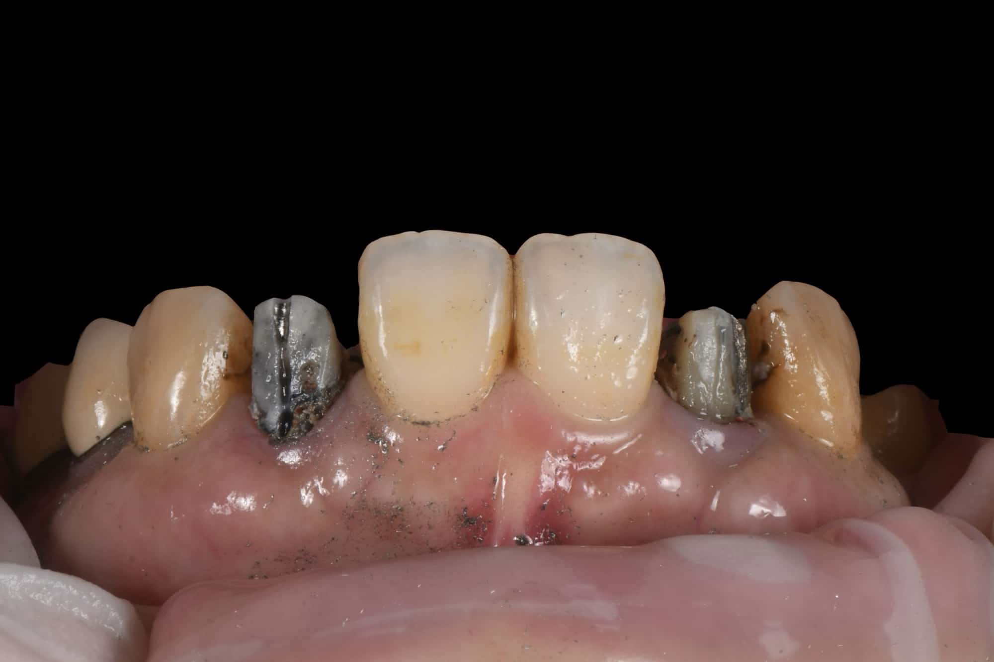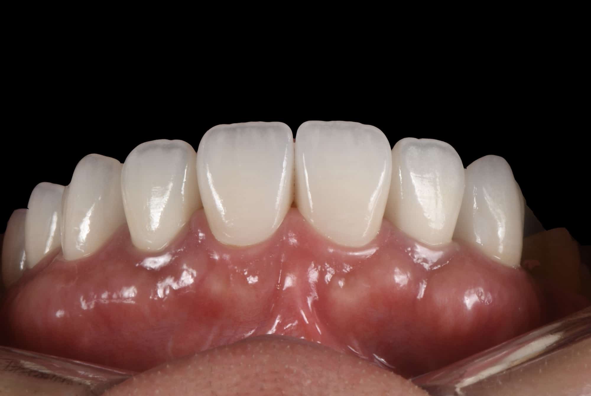 上圖做了兩顆全瓷冠與五顆貼片,藉由全瓷冠遮色跟技師現場染色,全瓷冠與貼片可以做到無違和的效果。
