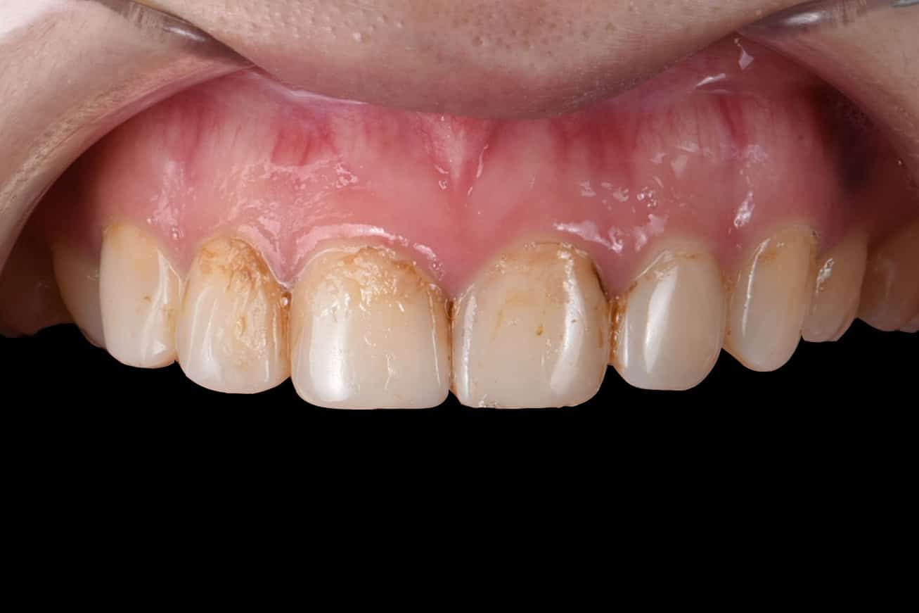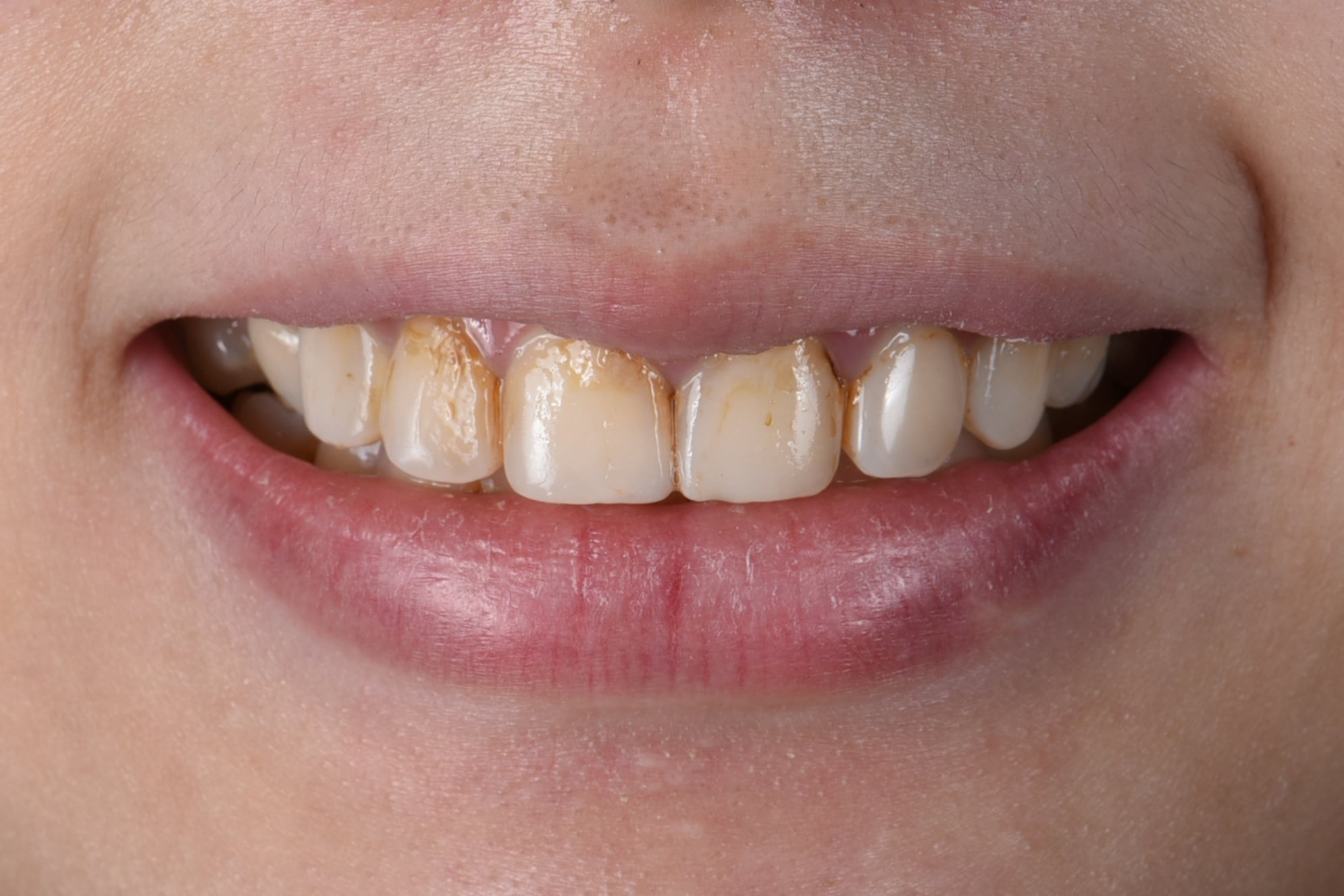 經過笑容分析,可以發現Yuan的門牙角度內凹,同時補過多次的樹脂皆已染色合併二度蛀牙